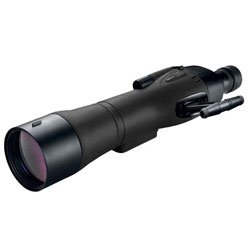 The new Porro prism ProStaff spotting scope provides exceptional optical capabilities, a powerful zoom eyepiece, high light transmission and superior ruggedness. Available in low profile 65mm and 82mm models, in either straight or angled body, the ProStaff spotting scope features a standard sliding hood, and a special optical peep sight that gets the user on target faster than ever before. Designed with a super-fast bayonet eyepiece connection, there are three other eyepieces, other than the standard Zoom (16x48x for the 65mm, 20-60x for the 82mm), available to fit the ProStaff spotting scope. Additional eyepieces available include: a20x LER (Long Eye Relief) Eyepiece for the 65mm (25x for the 82mm), a 20x Eyepiece for the 65mm (25x for the 82mm), and a 30x Wide Eyepiece for the 65mm (38x for the 82mm). Nikon's 20-60x82mm ProStaff spotting scope can be close focused to 20 feet, has a field of view at 1,000 yards of 99 feet, and has an exit pupil of 4.1mm at 20x. The straight body 82mm scope is 15 inches long, while the angled body is 15.4 inches long. It features 15.2mm of eye relief at 20x. The ProStaff spotting scope is O-ring sealed and nitrogen-purged for waterproof and fogproof performance. It incorporates Nikon's exclusive Eco-Glass (made without the use of arsenic or lead) and features bright, multicoated optics for improved light transmission. A rugged, textured body provides shock resistance and a firm grip. Like all Nikon Binoculars and Spotting Sc